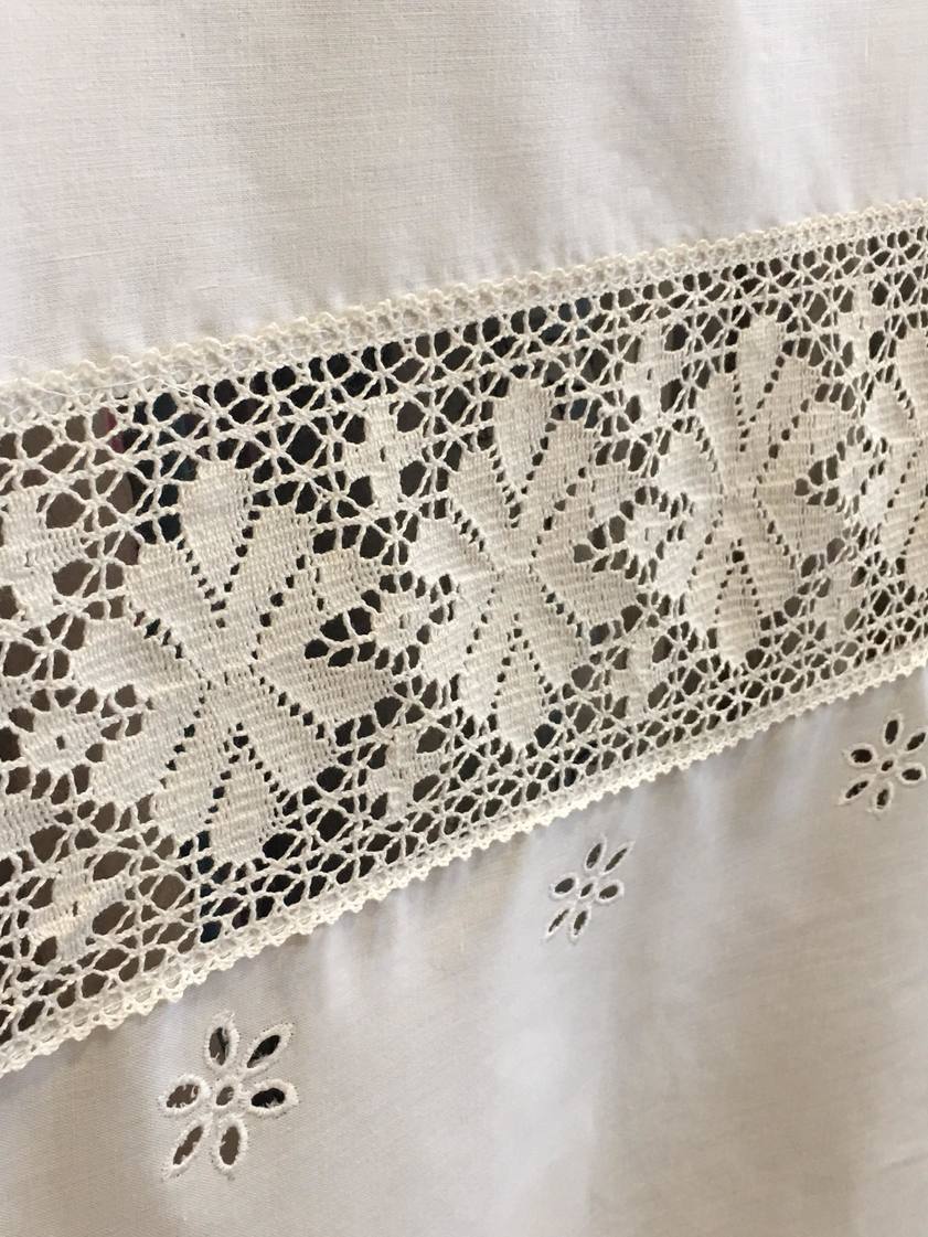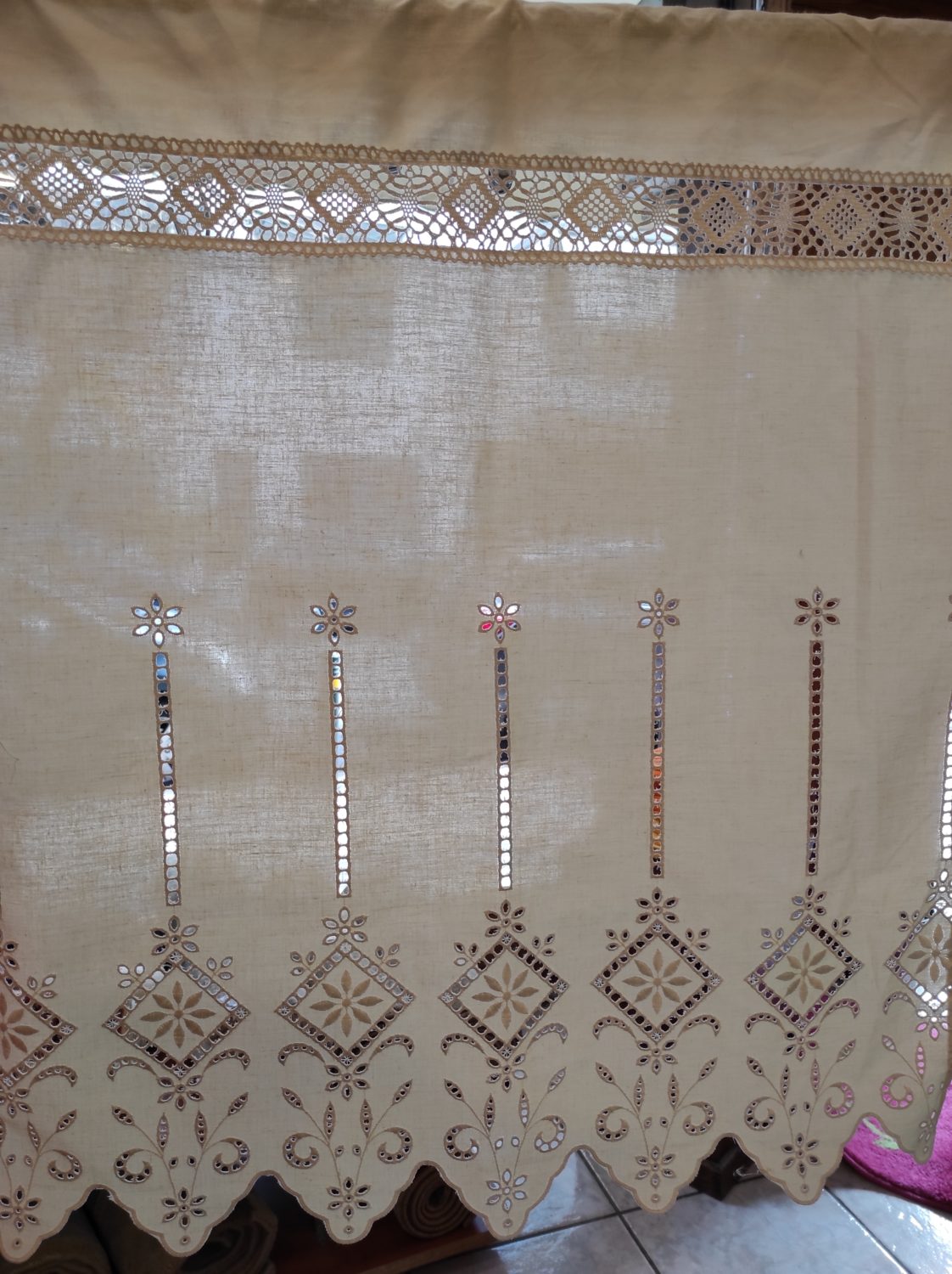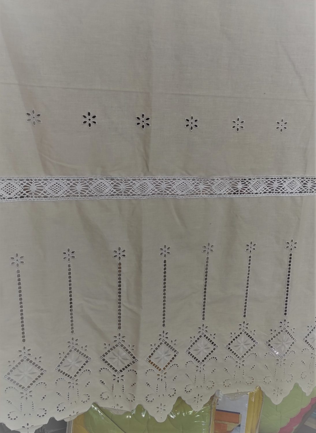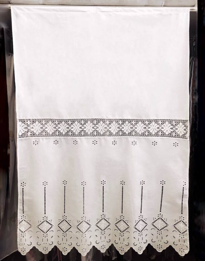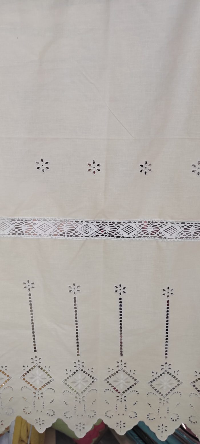 Κουρτίνα κοφτή, κεντητή, βαμβακερή σε λευκό και μπεζ χρώμα, με ενσωματωμένο ατραντέ.