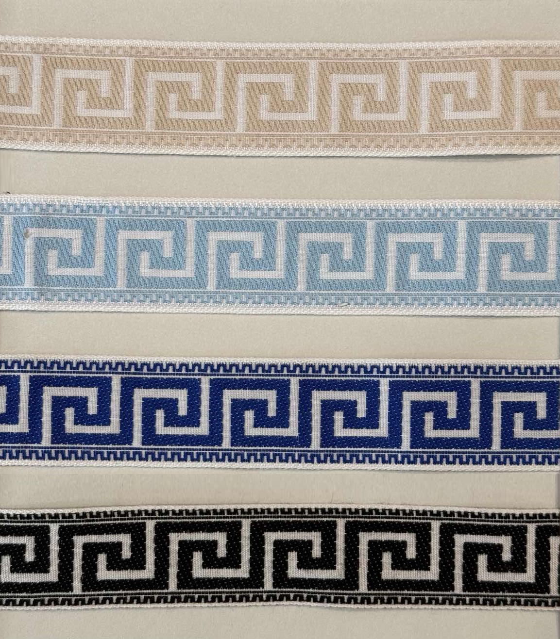Διακοσμητική τρέσα με μοτίβο μαίανδρου, σε τέσσερις κομψές αποχρώσεις. Κατασκευασμένη με υλικά υψηλής ποιότητας και λεπτομερή σφιχτή βελονιά, προσφέρει σταθερότητα και ανθεκτικότητα. Ιδανική για διακόσμηση σε ενδύματα, τραπεζομάντηλα, χειροποίητες κατασκευές, παραδοσιακές φορεσιές και θεματικά projects.