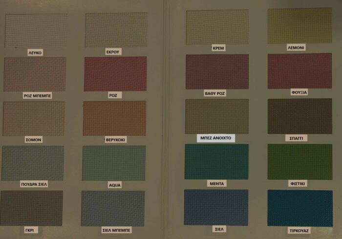 Λευκό, κρεμ, εκρού, μπεζ, σομόν, πούδρα σομόν, ροζ, ροζ bebe, πούδρα ροζ, σάπιο μήλο, πούδρα λιλά, λιλά, λεβάντα, σιελ, σιελ bebe, πούδρα σιελ, aqua, γκρι, φουντουκί, σπαγγί, κίτρινο, μέντα, κοράλι