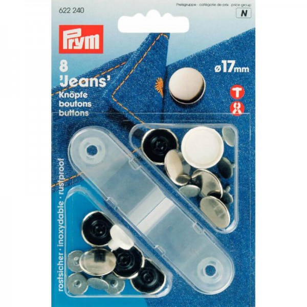 Ασημί κουμπιά για τζιν, διαμέτρου 17mm, από την Prym. Ιδανικά για αντικατάσταση ή προσθήκη σε τζιν παντελόνια. Η συσκευασία περιλαμβάνει 8 ανθεκτικά κουμπιά, εύκολα στην τοποθέτηση και κατάλληλα για μακροχρόνια χρήση.